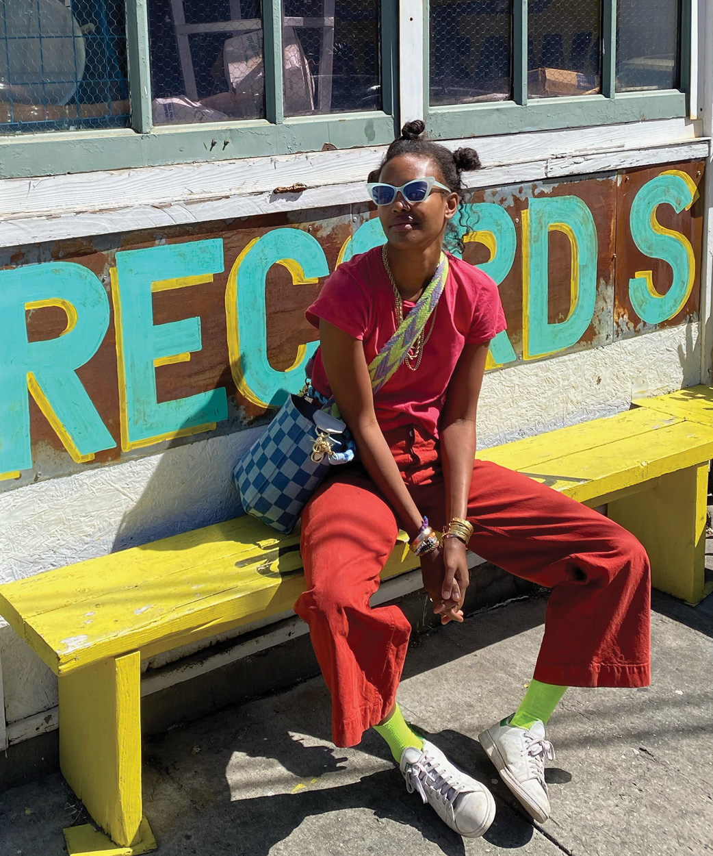 I think even on a not-great day I love being alive. I love walking in New York, I love my morning oat milk coffee, I love a lot of things. And loving things is energetic, and energy has to move or be expressed, which is why color is such a thing for me—dressing colorfully and even having it everywhere in my home. Hot pink, seafoam green, bright coral—it’s all so expressive and joyful! Why not wear all the colors and surround yourself in your home with them. I also love showing my stomach, my clavicle, my arms, and legs—I love showing skin! I have it, and I’m happy with it, so why not show it. All skin is so beautiful because it’s alive. There are some vintage skirts I have that are staples—they’re flowery and colorful and swishy, and I feel fluid and lyrical in them. And looooove a crop top and a bralette in summer—with a skirt or cutoffs.