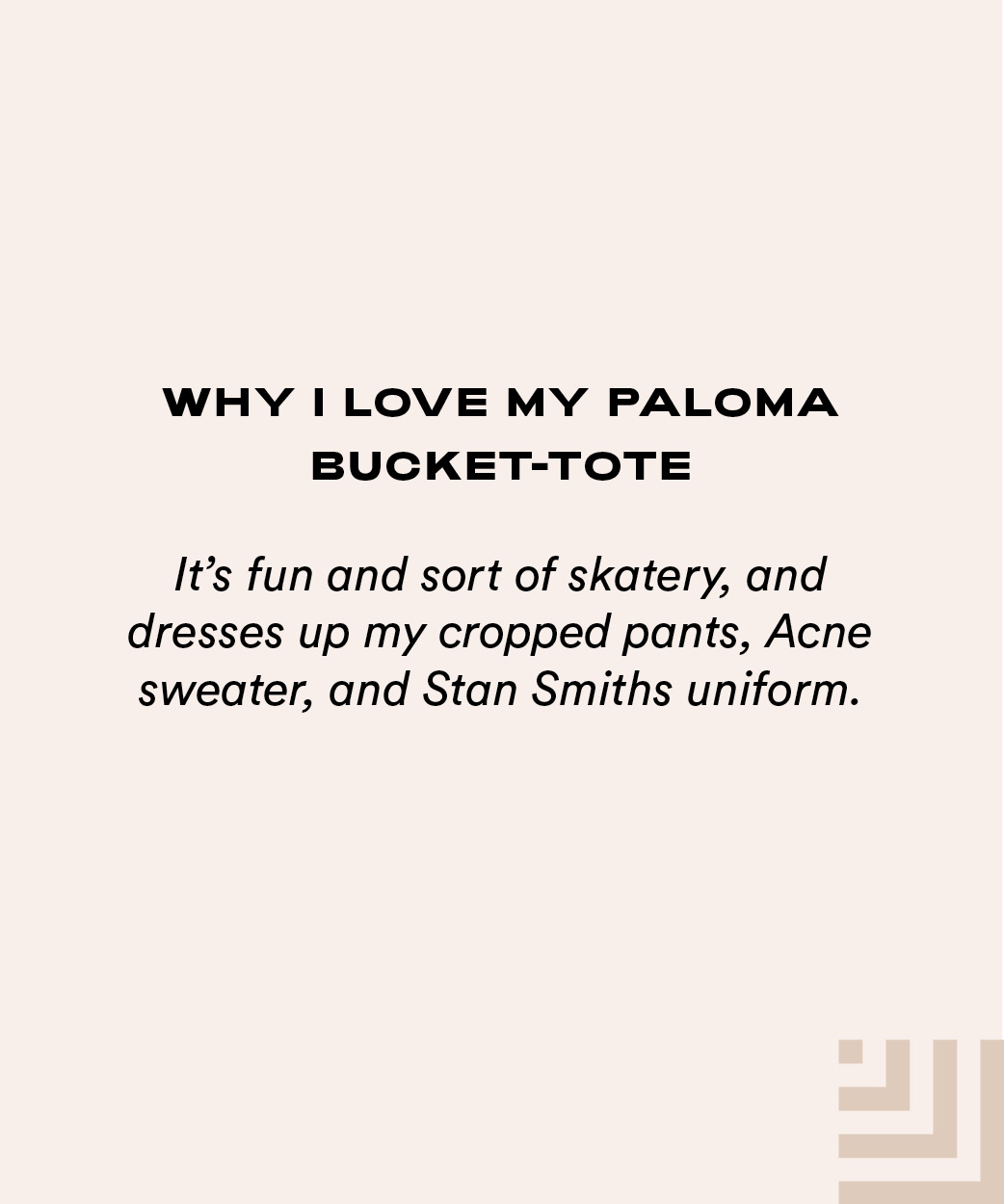 Is this cute little Salt Paloma bag lately, actually. It’s fun and sort of skatery, and dresses up my cropped pants, Acne sweater, and Stan Smiths uniform
