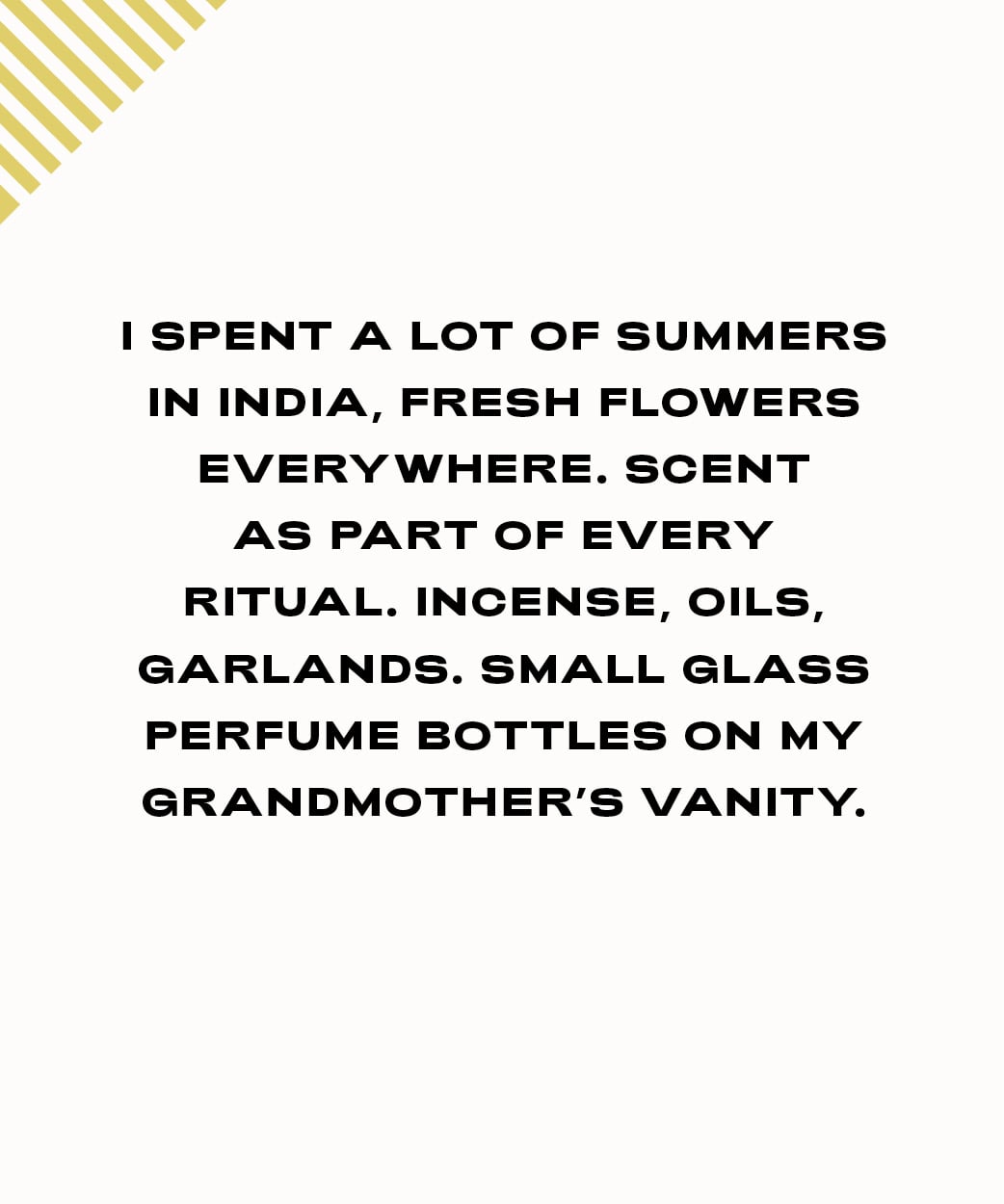 I spent a lot of summers in India—fresh flowers everywhere, scent as part of every ritual. Incense, oils, garlands. Small glass perfume bottles on my grandmother’s vanity.