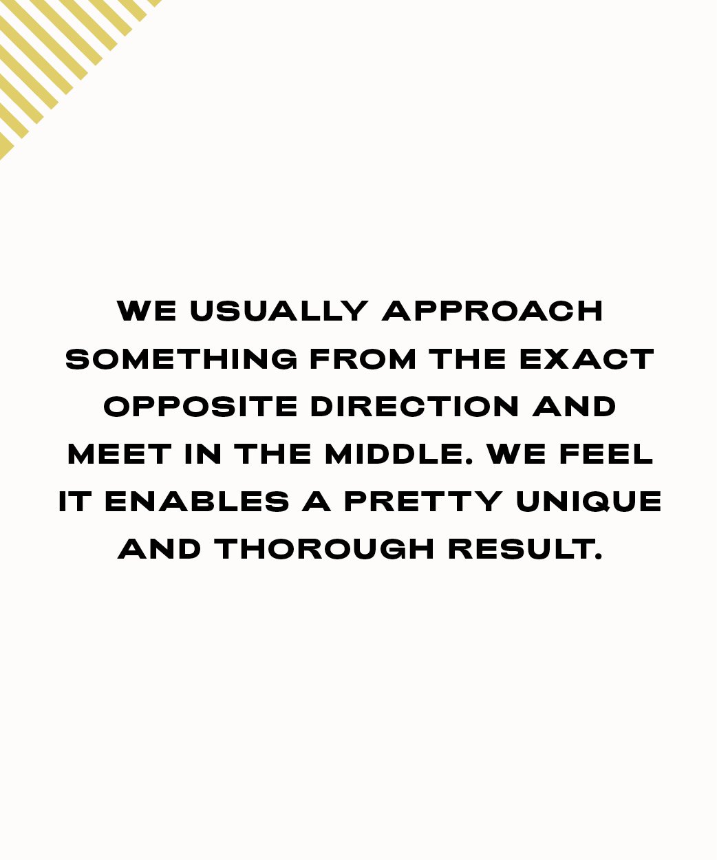 We usually approach something from the exact opposite direction and meet in the middle. We feel it enables a pretty unique and thorough result so try to celebrate our different approaches vs homogenize.
